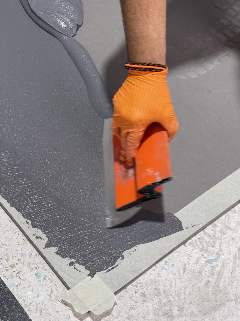 D’aspect minéral, il est composé à base de ciment puis teinté par nos soins, en magasin. Renforcé de résine et de fibre, il a le pouvoir d’adhérer sur de nombreux supports, même le carrelage.